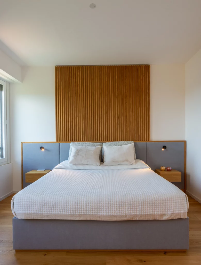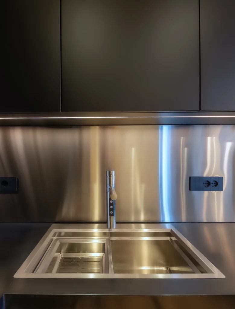 Casa TASS è un progetto che celebra il minimalismo come linguaggio architettonico, affidandosi a pochi materiali e a un’estetica di estrema raffinatezza contemporanea. Gli spazi si distinguono per la purezza delle linee e la sobria eleganza delle superfici, che lasciano alla luce naturale il ruolo di protagonista assoluta.La relax room si apre come un ambiente intimo e contemplativo, dove la palette neutra incontra texture sofisticate. Una parete scura, dal disegno materico e profondo, dialoga con il divano modulare dalle forme morbide e avvolgenti, mentre il pavimento in legno chiaro scalda l’atmosfera. Le ampie finestre incorniciano scorci urbani, creando un legame diretto tra interno ed esterno e invitando al riposo e alla meditazione. La cucina, interamente rivestita in acciaio inox, esprime una precisione quasi scultorea. Le superfici riflettenti amplificano la luce e conferiscono un carattere industriale ma elegante, esaltando la purezza del design e l’attenzione ai dettagli. Ogni elemento di Casa TASS è pensato per esprimere essenzialità e armonia. L’uso calibrato di materiali pregiati e la scelta di arredi dal design rigoroso ma accogliente trasformano gli spazi in un’esperienza sensoriale che unisce comfort e modernità, incarnando pienamente l’idea di un minimalismo sofisticato e senza tempo.
