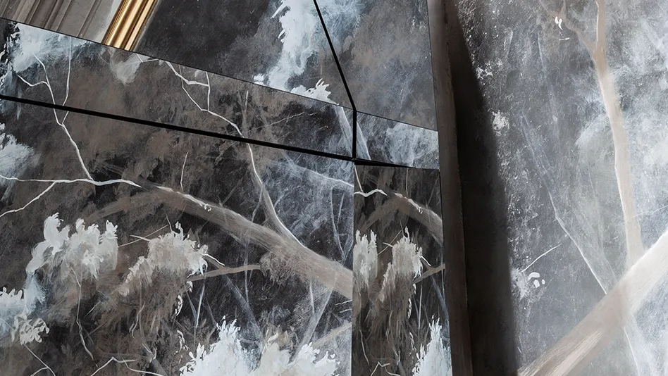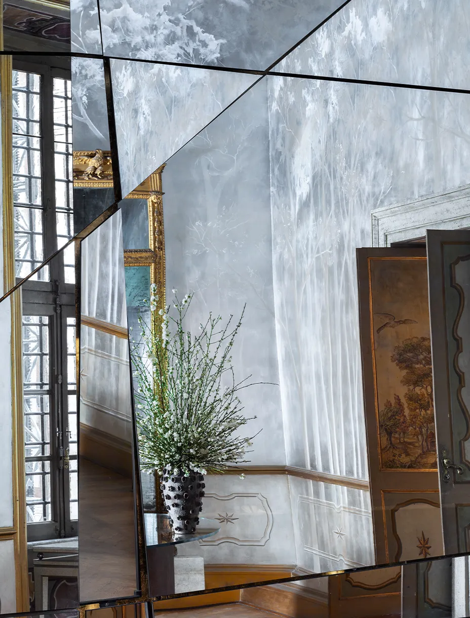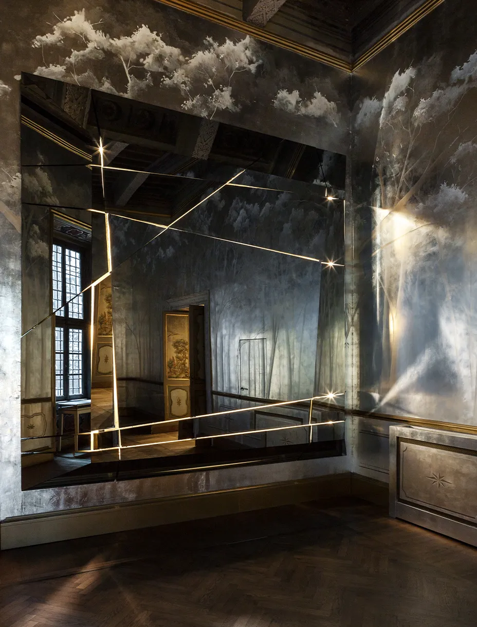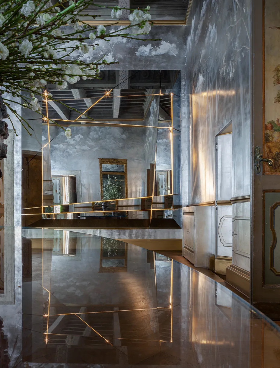 The Mirror of Wonders, firmato da Fabio Mazzeo e installato nella hall di un palazzo seicentesco in via Giulia, è un’opera che unisce arte e ingegneria. Un fondale in foglia d’oro retroilluminato accoglie una grande superficie specchiante di oltre quattro metri, composta da sezioni mobili e da uno schermo integrato.