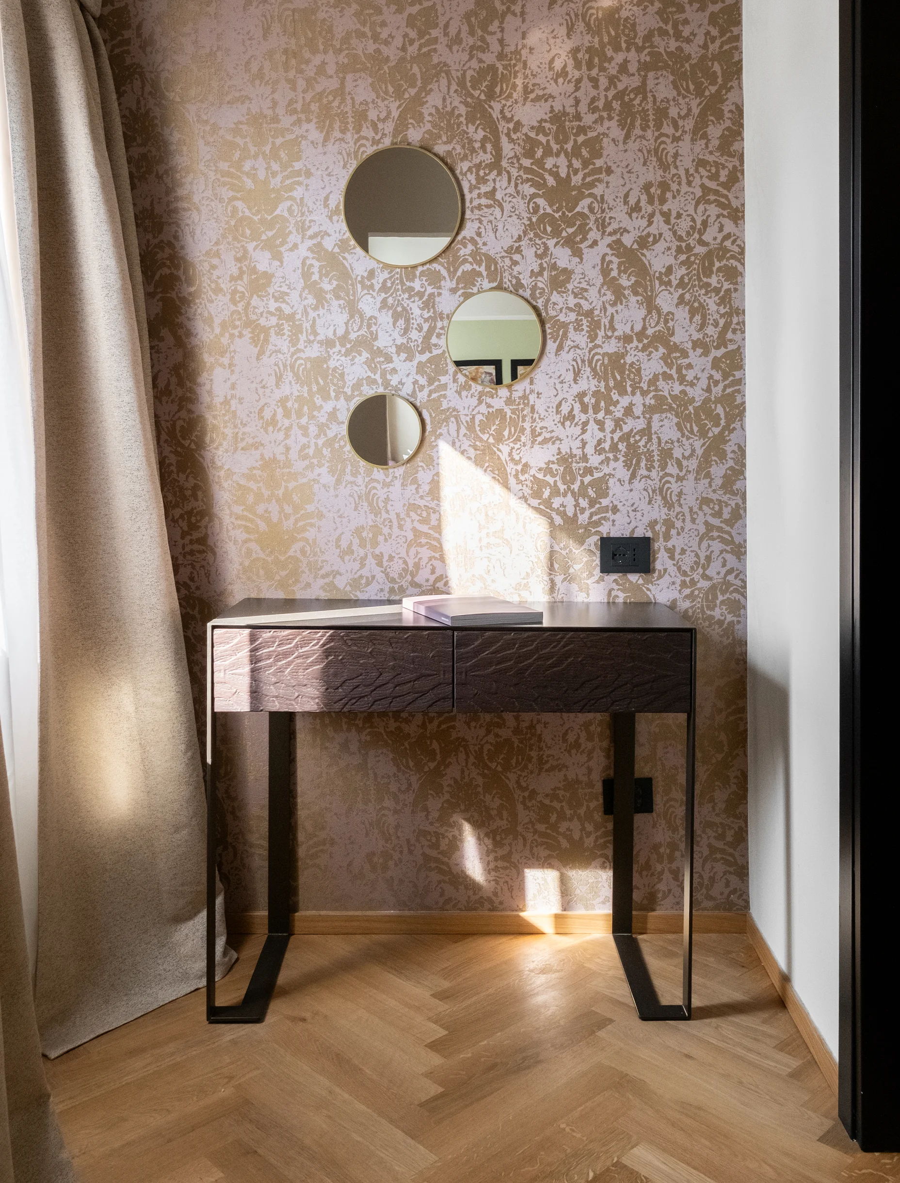 L’intervento intreccia con equilibrio la classicità veneziana e uno stile essenziale, restituendo nuova vita agli spazi senza tradirne l’anima. Materiali nobili e dettagli artigianali si fondono con la laguna, creando atmosfere sospese tra memoria e presente.
