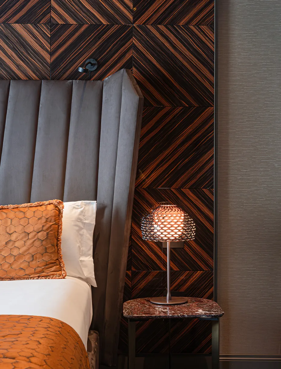 Questa forza materica dialoga con colori audaci e vibranti, capaci di dare ritmo e dinamismo agli ambienti, e con tessuti pregiati che avvolgono lo spazio. Boiserie e arredi su misura creano continuità tra hall, lounge e stanze, generando un percorso armonico e senza interruzioni. Ogni dettaglio concorre a definire un’atmosfera calda, accogliente e sofisticata.