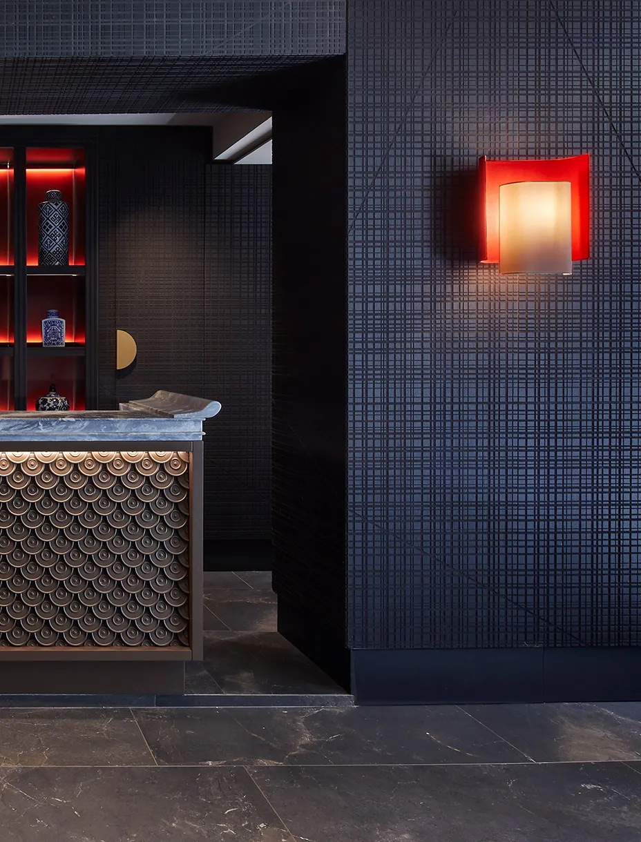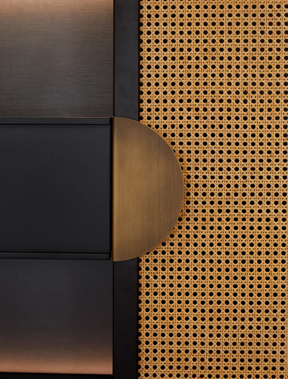 Boiserie su misura e arredi sartoriali dialogano con la luce mutevole di Venezia, riflessa nei vetri e nei marmi. I materiali, scelti tra essenze lignee scure e tessuti preziosi, si intrecciano a superfici pure e dettagli calibrati, generando un linguaggio sobrio e raffinato.