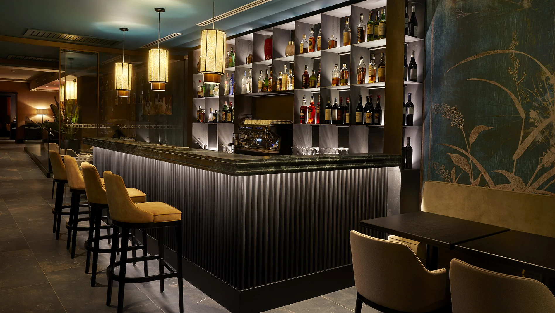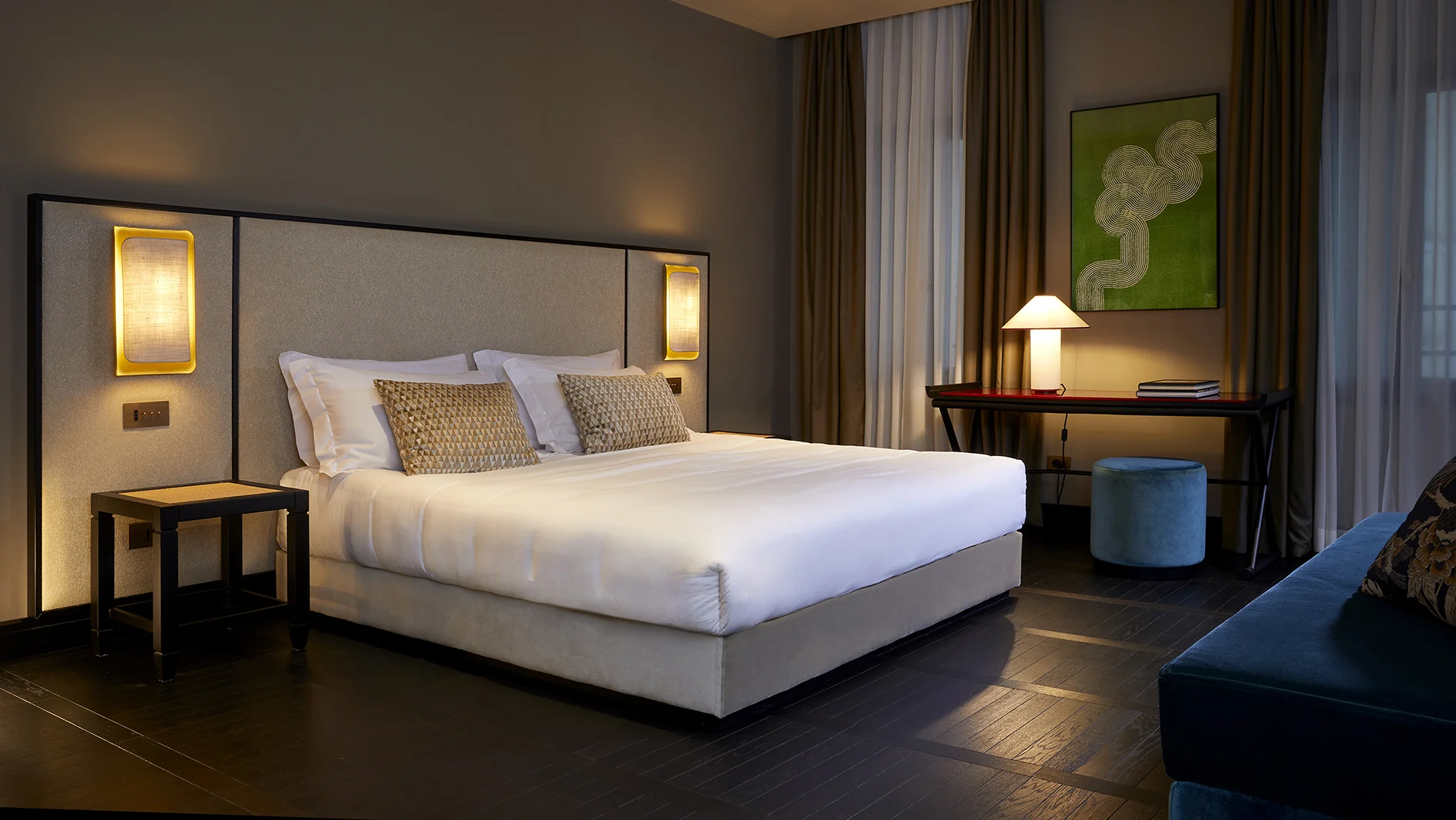 Nelle camere, linee essenziali accompagnano cromie profonde, mentre dettagli bespoke restituiscono l’esperienza di uno spazio pensato come abito su misura. Ogni superficie diventa narrazione, ogni venatura del legno un segno che racconta di calore, ogni riflesso un invito alla contemplazione.